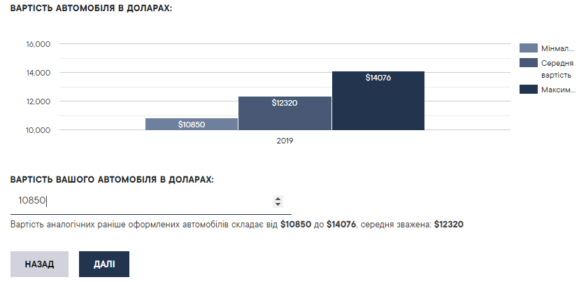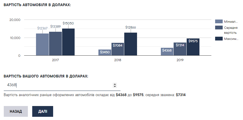 Как видим, калькулятор сам задает оценку автомобиля  минимально 12 313 долларов (с учетом уровня цен на рынке, а не технических параметров авто).