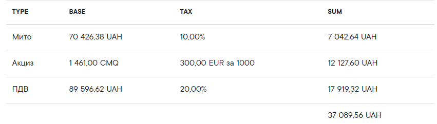 3 этап: расчет таможенного налога, акцизного сбора и ПДВ и итоговая стоимость "растаможки".
