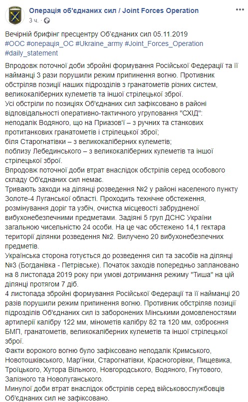 С начала суток вторника, 5 ноября, в районе проведения операции Объединенных сил на Донбассе противник совершил всего три обстрела. Об этом сообщили в пресс-службе ООС.