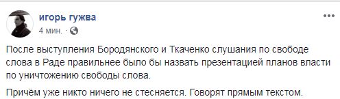 "После выступления Бородянского и Ткаченко слушания по свободе слова в Раде правильнее было бы назвать презентацией планов власти по уничтожению свободы слова", - написал он. И добавил: "Причём уже никто ничего не стесняется. Говорят прямым текстом".
