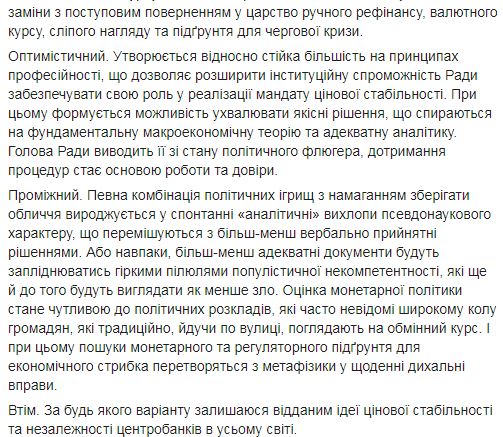 "Режим инфляционного таргетирования размывается и деклассируется, оценочные суждения в отношении банковского регулирования и надзора превращаются в площадку потакания олигархическому банкингу, МВФ объявляется злом, на основе чего расширяются возможности избегать давления на бывших владельцев финучреждений по выведенным средствам, а отношения с правлением доводятся до абсурда с целью открытия политического шлюза для его замены с постепенным возвращением в царство ручного рефинанса, валютного курса, слепого надзора и основания для очередного кризиса", – описал этот сценарий член совета.