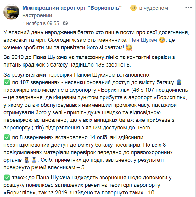 В 2019 году пассажиры Международного аэропорта "Борисполь" 139 раз обращались на горячую линию и в другие службы по поводу краж из багажа. Об этом пресс-служба аэропорта написала в Facebook.