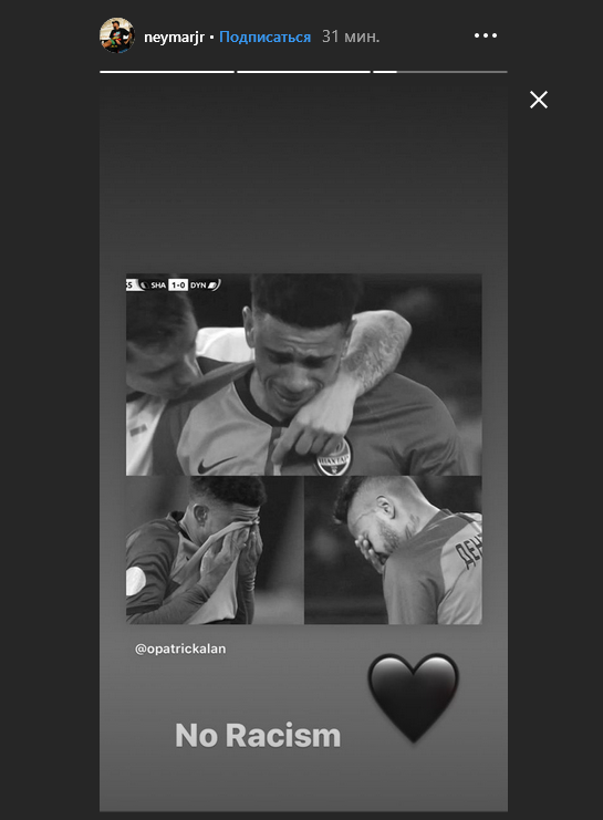 "Нет расизму", - написал Неймар, сделав репост поста Алана Патрика об этом инциденте.