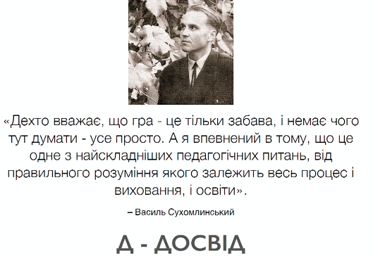 При этом во время своей презентации Корниенко выводит на очередной слайд слова советского педагога-новатора Василия Сухомлинского, который первым внедрил развивающие методы и игровые формы обучения: "Кто-то считает, что игра - это лишь развлечение, и незачем тут думать - все просто. А я уверен в том, что это одно из самых сложных педагогических вопросов, от правильного понимания которого зависит весь процесс и воспитания, и образования".