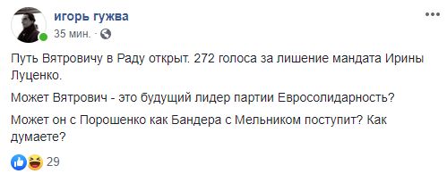 Главред "Страны" Игорь Гужва предположил, что в Раде он затмит самого Порошенко: "Путь Вятровичу в Раду открыт. 272 голоса за лишение мандата Ирины Луценко. Может Вятрович - это будущий лидер партии Евросолидарность?