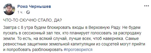 "Завтра с 8 утра будем блокировать входы в Верховную Раду. Не будем пускать в сессионный зал тех, кто планирует голосовать за распродажу земли. То есть, на всякий случай, лучше всех, чтоб наверняка. Самые ревностные защитники земельной капитуляции из соцсетей могут прийти и попробовать разблокировать (вход - Ред.)".