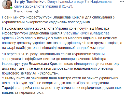 "10 сентября 2019 года Национальный союз журналистов Украины обратился с официальным письмом к новоназначенному министру инфраструктуры Владиславу Криклию по вопросу повышения цен на почтовую доставку газет, которую пытался ввести национальный оператор почтовой связи АО "Укрпочта". В этом письме мы призвали господина министра встать на защиту украинских газет и их аудитории и не вводить в действие приказ "Об утверждении тарифов на прием и доставку отечественных периодических печатных изданий по подписке".