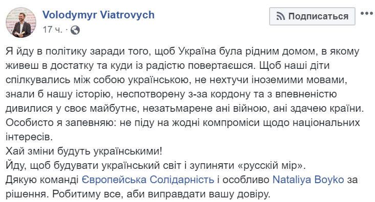 Во вторник, 12 ноября, на Facebook-странице Вятровича появилась заметка о его желаниях и задачах "похода в политику". В частности, говорится, о детях, говорящих на украинском языке и превращении Украины в ту, в которую "можно с радостью возвращаться".