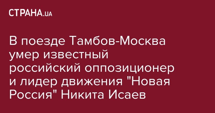 В России умер лидер движения "Новая Россия" и директор Института актуальной экономики Никита Исаев. Тело 41-летнего мужчины обнаружили в поезде, который направлялся из Тамбова в Москву. Об этом рассказала его пресс-секретарь Александр Макаренко, передает "РБК".