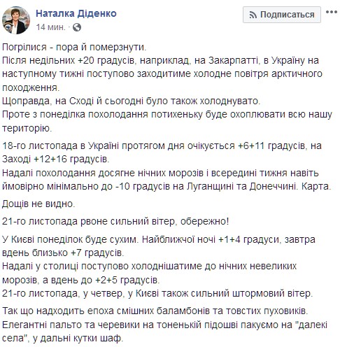 "В дальнейшем в столице будет постепенно холодать до ночных небольших морозов, а днем до + 2 + 5 градусов. 21-го ноября, в четверг, в Киеве также сильный штормовой ветер. Так что приходит эпоха смешных баламбонов и толстых пуховиков. Элегантные пальто и ботинки на тоненькой подошве пакуем на "далекие села", в дальние уголки шкафов", - сказала Диденко.