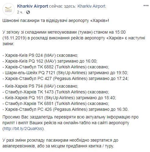 Из-за сильного тумана в понедельник в Международном аэропорту "Харьков" отменен ряд рейсов. Об этом сообщается на странице аэропорта в соцсети Facebook.