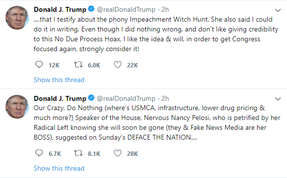 Ранее демократ Пелоси предложила Трампу явиться к конгрессменам для дачи показаний в рамках слушаний о возможности запуска процедуры импичмента в отношении президента страны. Она допустила возможность того, чтобы Трамп ответил на вопросы письменно.
