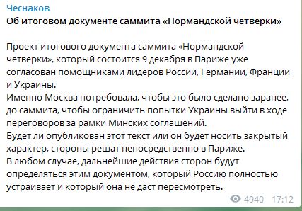 "Именно Москва потребовала, чтобы это было сделано заранее, до саммита, чтобы ограничить попытки Украины выйти в ходе переговоров за рамки Минских соглашений. Будет ли опубликован этот текст или он будет носить закрытый характер, стороны решат непосредственно в Париже", - сообщил Чеснаков.
