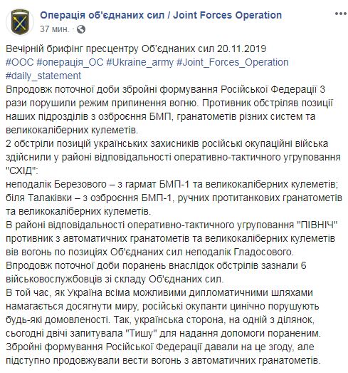 "В течение текущих суток ранения в результате обстрелов получили 6 военнослужащих из состава Объединенных сил", - говорится в ообщении.