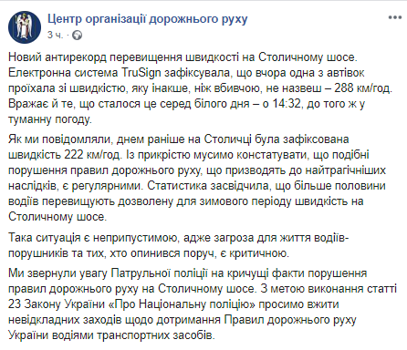 "Вчера одна из машин проехала со скоростью, которую иначе, чем убийственной не назовешь — 288 км/ч. Поражает и то, что произошло это среди бела дня — в 14:32, к тому же в туманную погоду", — заявили в центре.