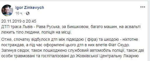 В среду, 20 ноября, во Львовской области произошло дорожно-транспортное происшествие с участием трех транспортных средств - двух автомобилей и подводы. Об этом сообщил депутат Львовского городского совета Игорь Зинкевич на своей странице в Facebook.