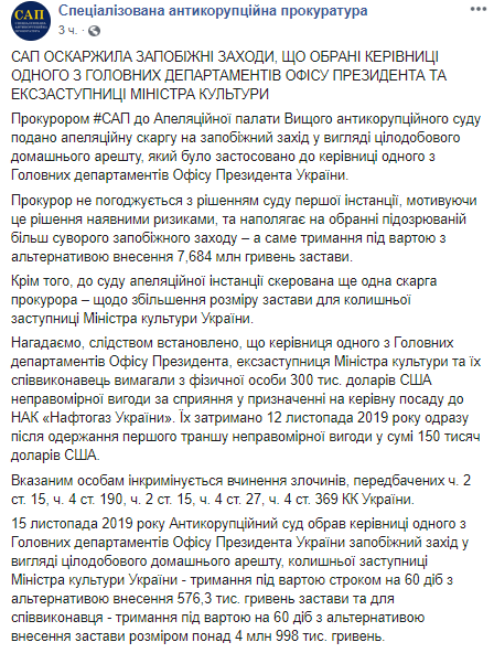 "Прокурор не соглашается с решением суда первой инстанции, мотивируя это решение имеющимися рисками, и настаивает на избрании подозреваемой более строгого пресечения, а именно содержание под стражей с альтернативой внесения 7,684 млн гривен залога. Кроме того, в суд апелляционной инстанции направлена еще одна жалоба прокурора - по увеличению размера залога для бывшего заместителя Министра культуры Украины", - говорится в сообщении.