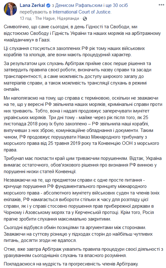 "Мы настаиваем на том, что дело является срочным, так как несмотря на то, что в сентябре РФ освободила наших моряков, уголовные дела против них продолжаются. То есть, она и дальше продолжает отрицать иммунитет украинских моряков. Три дня назад - почти через год после того, как 25 ноября 2018 года они были захвачены - РФ освободила наши корабли, изъяв из них оружие, коммуникационное оборудование и документы. Таким образом, РФ продолжает нарушать решение Международного трибунала по морскому праву от 25 мая 2019 года и Конвенцию ООН по морскому праву", - отметила Зеркаль.