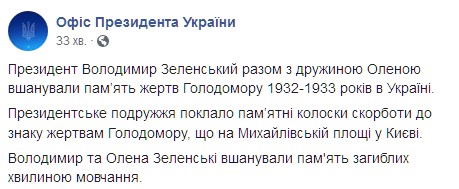 Президент Украины Владимир Зеленский вместе с супругой Еленой почтили память жертв Голодомора 1932-1933 годов. Об этом сообщает пресс-служба Офиса президента в Facebook.