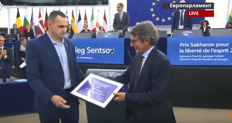 После выступления узника Кремля президент Европейского парламента Давид Сассоли вручил Сенцову премию.