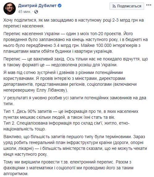 Министр кабинета министров Дмитрий Дубилет решил провести электронную перепись населения, тем самым сэкономив два миллиарда гривен. Об этом он написал на странице в Facebook.