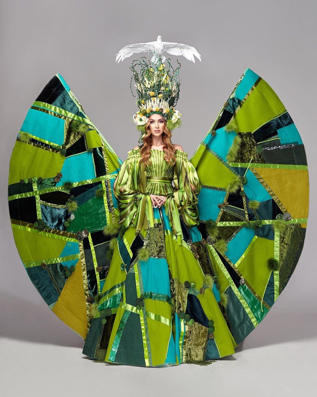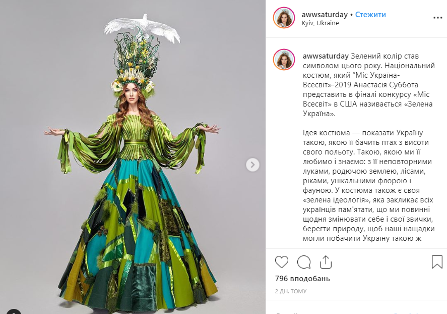 "Идея костюма - показать Украину такой, какой ее видит птица с высоты своего полета. Такой, какой мы ее любим и знаем: с ее неповторимыми лугами, плодородной землей, лесами, реками, уникальными флорой и фауной. В костюме тоже есть своя "зеленая идеология", которая призывает всех украинцев помнить, что мы должны ежедневно менять себя и свои привычки, беречь природу, чтобы наши потомки могли увидеть Украину такой же прекрасной. Костюм весит 28 кг. Над изготовлением костюма тщательно работала команда из 10 человек в течение 2,5 месяцев", - написала в соцсети Анастасия Суббота.