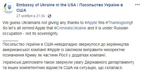 "Посольство Украины в США безотлагательно обратилось к руководству американской компании Apple с призывом исправить некорректное обозначение Крыма как части России в приложениях компании... Украинские дипломаты также обратили внимание Государственного департамента и других компетентных ведомств США на сложившуюся ситуацию", - говорится в сообщении.