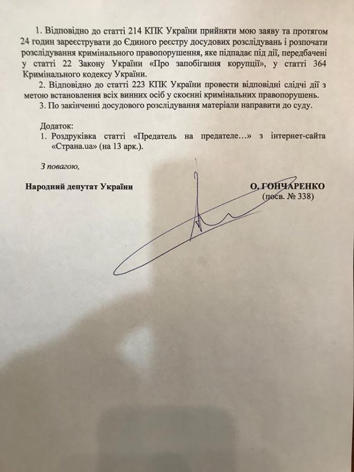 Также Гончаренко уточнил, что надеется на то, что "дело доведут до конца".