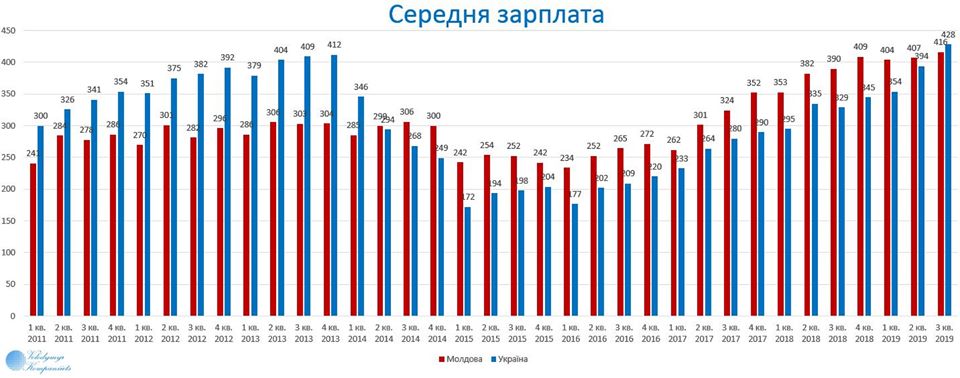 "Государственная служба статистики Молдовы обнародовала данные по средней зарплате в третьем квартале 2019 года, она составила 7385 лея (416 долларов). В Украине средняя зарплата в третьем квартале 2019 составила 428 долларов, что позволило Украине впервые за 5,5 лет обойти Молдову по размеру средней зарплаты", – подчеркнул Компаниец.