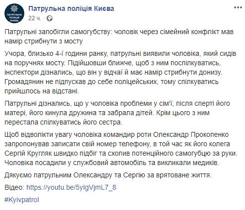 "Чтобы отвлечь внимание мужчины, командир роты Александр Прокопенко предложил записать свой номер телефона, в то время как его коллега Сергей Кругляк быстро подбежал и схватил потенциального самоубийцу за руки. Мужчину посадили в служебный автомобиль и вызвали медиков. Спасибо патрульным Александру и Сергею за спасенную жизнь", - идет речь в сообщении.