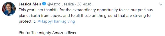 "В этом году я благодарна за невероятную возможность увидеть нашу прекрасную планету Земля с высоты и всем тем внизу, кто стремится защитить ее", - написала Меир.
