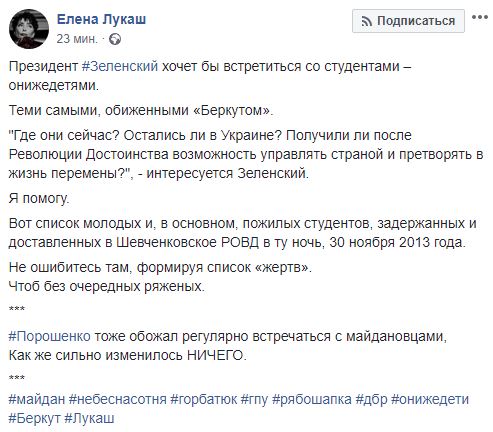 Сегодня, 30 ноября, после того, как стало известно о планах Зеленского встретиться со студентами, которых на Майдане избили беркутовцы, экс-министр юстиции Украины Елена Лукаш на своей странице в Facebook опубликовала список этих "студентов".