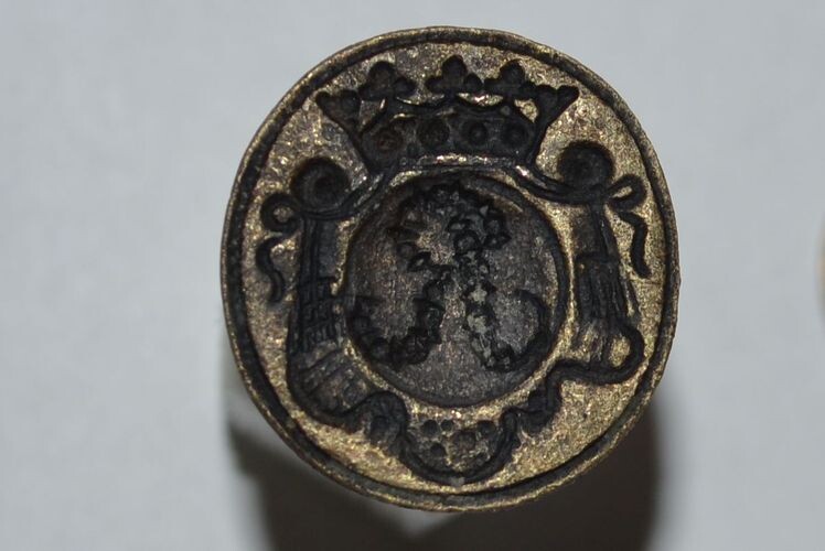 По словам доктора исторических наук Андрея Гречило, это частная печать шляхтича, которая относится к первой половине XIX века. Поскольку на ней отсутствует герб и изображен лишь инициал, то определить ее принадлежность можно лишь случайно - если повезет обнаружить такие отпечатки на каком-то документе. Возможно, она принадлежала кому-то из местных землевладельцев.