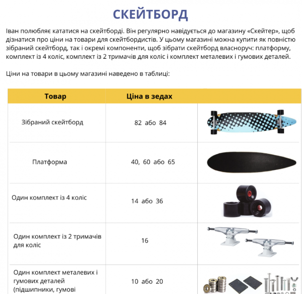 Математика. Среди заданий, например, ученикам предлагали ознакомиться с ценами на готовый скейтборд и детали к нему, а затем посчитать, во сколько им обойдется собрать его при условии наличия некоторых компонентов.