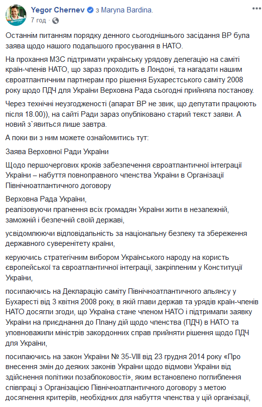 Нардеп от "Слуги народа", глава Постоянной делегации Украины при Парламентской Ассамблее НАТО Егор Чернев сообщил, что из-за технической ошибки на сайте Верховной Рады опубликовали не тот текст заявления о курсе на Альянс.