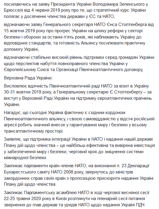 Напомним, что в опубликованном на сайте Рады версии отмечается, что Верховная Рада призывает президента "обеспечить подготовку и представление в декабря 2019 года в Североатлантического совета НАТО и Генерального секретаря НАТО обращения о подтверждении намерения Украины получить План действий по членству в НАТО".