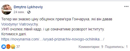 Бывший директор Украинского института национальной памяти, а сейчас нардеп от фракции "Европейская солидарность" Владимир Вятрович высказался о новом главе ведомства. Об этом он написал на своей странице в Facebook.