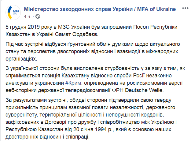 В МИД Украины днем 5 декабря пригласили посла Казахстана Самата Ордабаева, чтобы выразить обеспокоенность по поводу позиции Казахстана относительно аннексии Крыма Россией. Об этом сообщается в Facebook министерства.