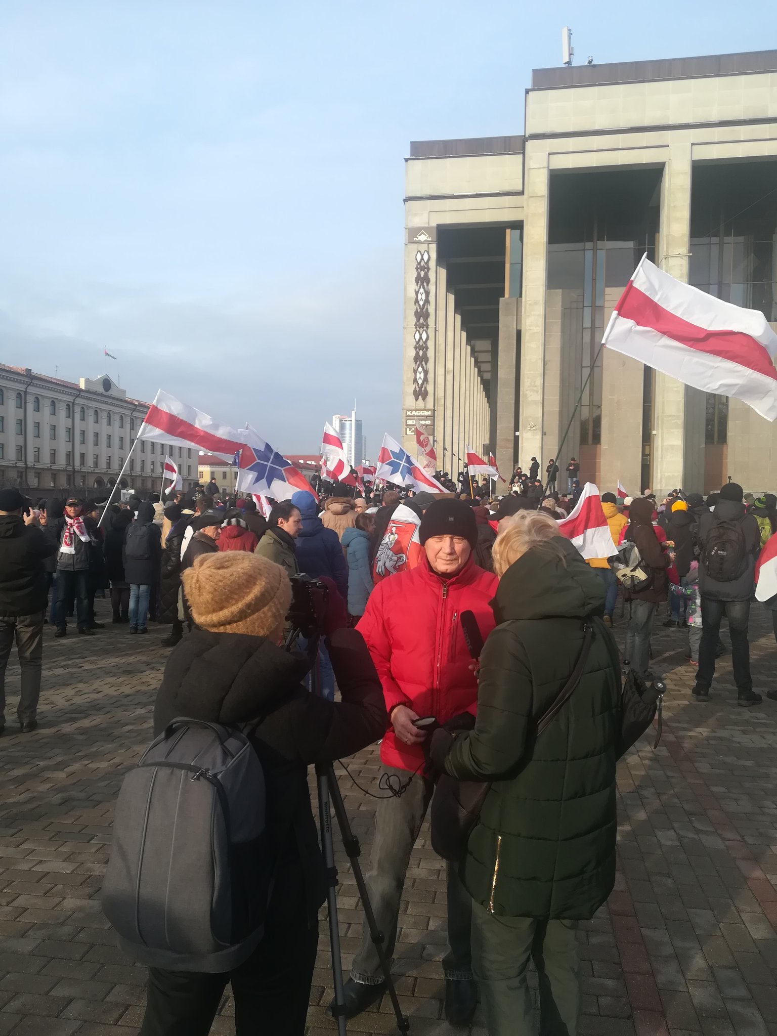 Так, несколько сотен человек выстроились в живую цепь возле проспекта Независимости в центре Минска, а также вдоль Октябрьской площади. Среди участников заметны люди с бело-красно-белыми флагами (бывший государственный флаг Беларуси до 1995 года). Сейчас его используют националисты.
