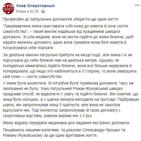 В Киеве 6 декабря около 5 часов утра женщина с ножом хотела совершить суицид, однако ее успели спасти полицейские. Об этом сообщается на странице "Киев Оперативный" в Facebook.