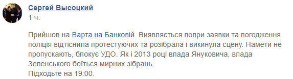 "Пришел на Варта на Банковой. Оказывается несмотря на заявки и согласования полиция оттеснила протестующих и разобрала и выбросила сцену. Палатки не пропускают, блокирует УГО. Как и 2013 году власть Януковича, власть Зеленского боится мирных собраний.