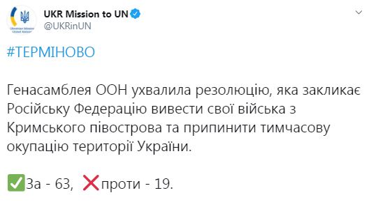 Так, резолюцию по Крыму поддержали представители 63 государств-участниц Генассамблеи ООН. Против документа выступили 19 стран. "Генассамблея ООН приняла резолюцию, которая призывает Российскую Федерацию вывести свои войска с Крымского полуострова и прекратить временную оккупацию территории Украины. За - 63, против - 19", - говорится в заявлении.