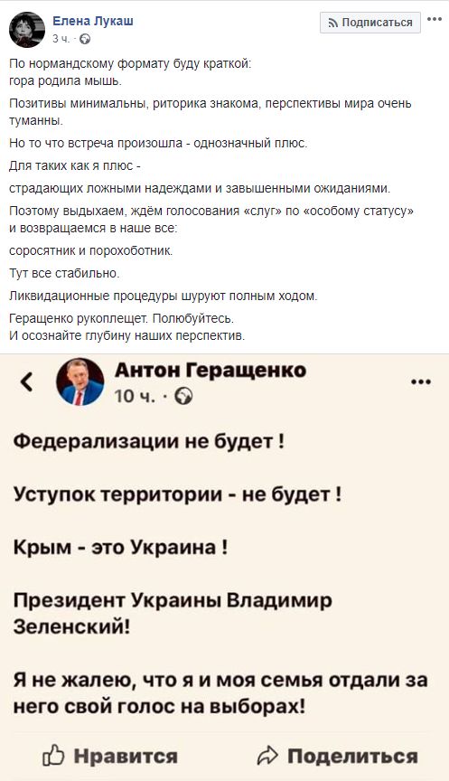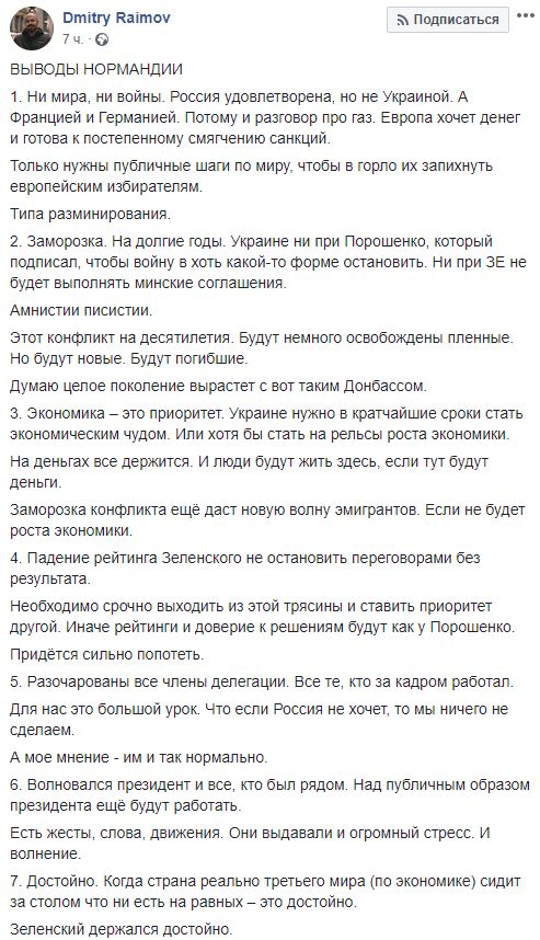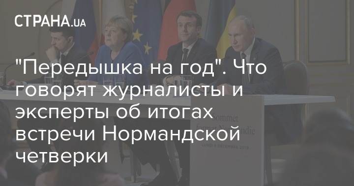 "Встреча в Париже, ожидаемо, закончилась ничем. Стороны обменялись общими , ничем не обязывающими заявлениями, договорились договариваться , а Зеленский пообещал имплементировать формулу Штайнмайера в конституцию, хотя по самой формуле нет компромисса, что превращает его обещание в профанацию. Смелее всех оказалась традиционно консервативная А. Меркель, которая сказала, что Минские соглашения -это "не закостенелая догма и стороны могли бы придать им большей эластичности". Свежо, но бесплодно.