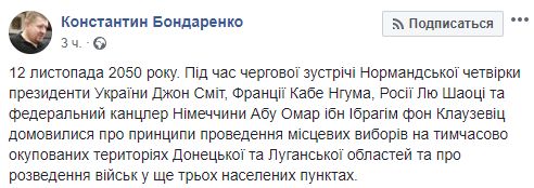 "12 ноября 2050. Во время очередной встречи Нормандской четверки президенты Украины Джон Смит, Франции Кабе Нгум, России Лю Шаоци и федеральный канцлер Германии Абу Омар ибн Ибрагим фон Клаузевиц договорились о принципах проведения местных выборов на временно оккупированных территориях Донецкой и Луганской областей и о разведении войск в еще трех населенных пунктах".