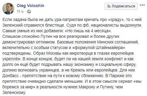 "Если задача была не дать ура-патриотам кричать про "зраду", то с ней Зеленский справился блестяще. Судя по фб, националисты выдохнули. Самые умные из них добавили: "Но лишь на 4 месяца".