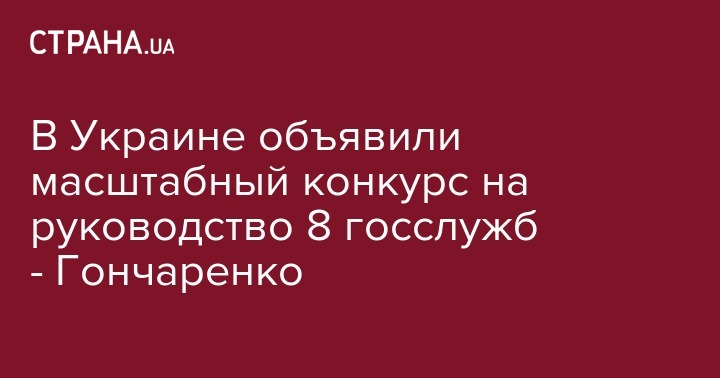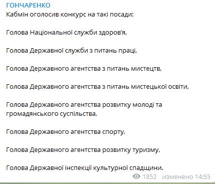 Согласно сообщению Гончаренко, Кабмин объявил конкурс на главу Национальной службы здоровья, Государственной службы по вопросам труда, Государственного агентства по вопросам искусств, Государственного агентства по вопросам образования в сфере искусства, Государственного агентства развития молодежи и гражданского общества, Государственного агентства спорта, Государственного агентства развития туризма, Государственной инспекции культурного наследия.