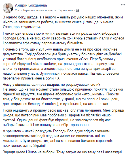 "Находясь в коротком отпуске между ротациями, наткнулся по дороге на человека, который сначала провоцировал, а потом чуть не стал виновником аварии при нашем общем участии. Остановились, началась ругань. Во время словесной перепалки плюнул мне в лицо" – написал Богданец и отметил, что после это ударил мужчину, "не рассчитав силу".