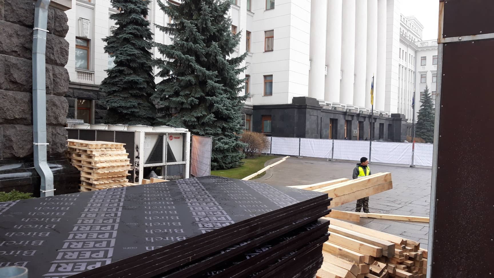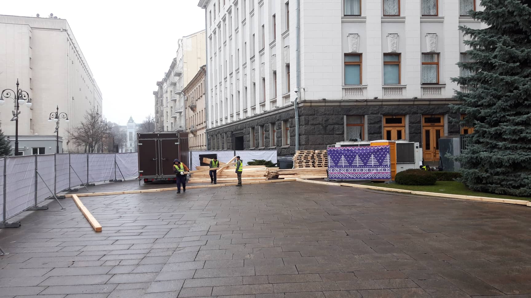 У здания Офиса президента на улице Банковой в Киеве начали устанавливать каток. Материалы для строительства привезли поздно вечером, а ночью установили ограждения.