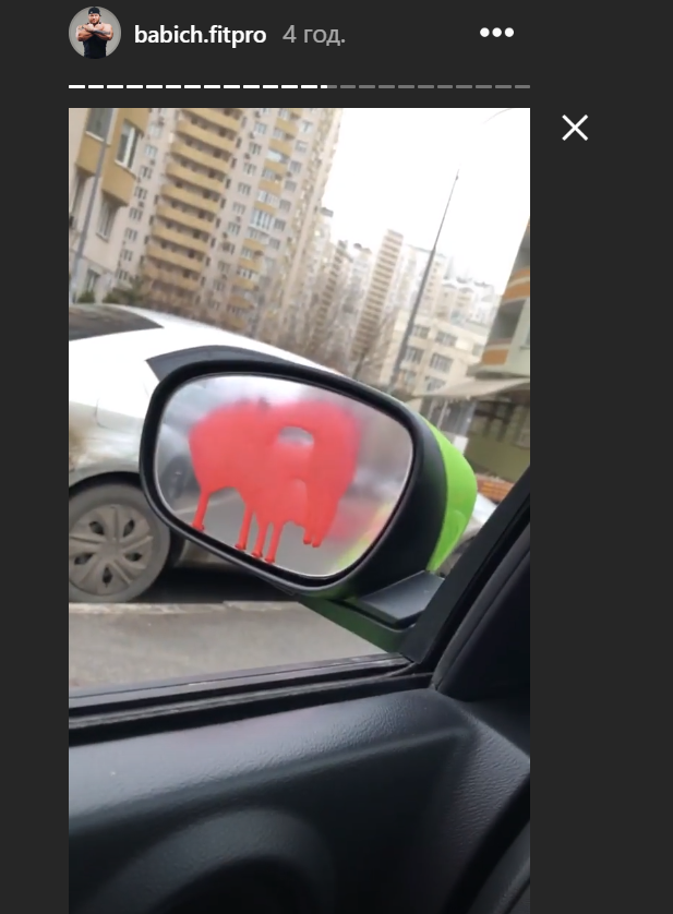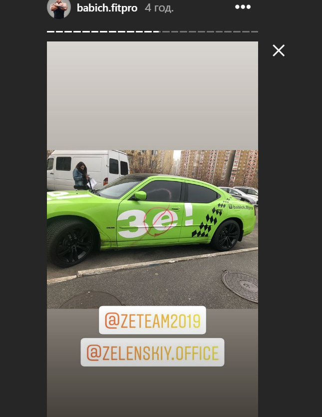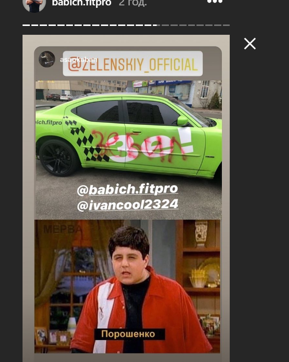 Также опубликовано видео, на котором видно, что его автомобиль Dodge Charger SRT-8, раскрашенный в цвета команды Зеленского, вандалы облили красной краской, перечеркнув слово "Зе". Также вандалы написали оскорбление "Зебил".