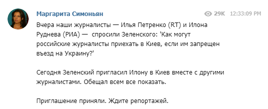 Вчера наши журналисты - Илья Петренко (RT) и Илона Руднева (РИА) - спросили Зеленского: "Как могут российские журналисты приехать в Киев, если им запрещен въезд на Украину?". Сегодня Зеленский пригласил Илону в Киев вместе с другими журналистами. Обещал всем все показать", - написала Симоньян.